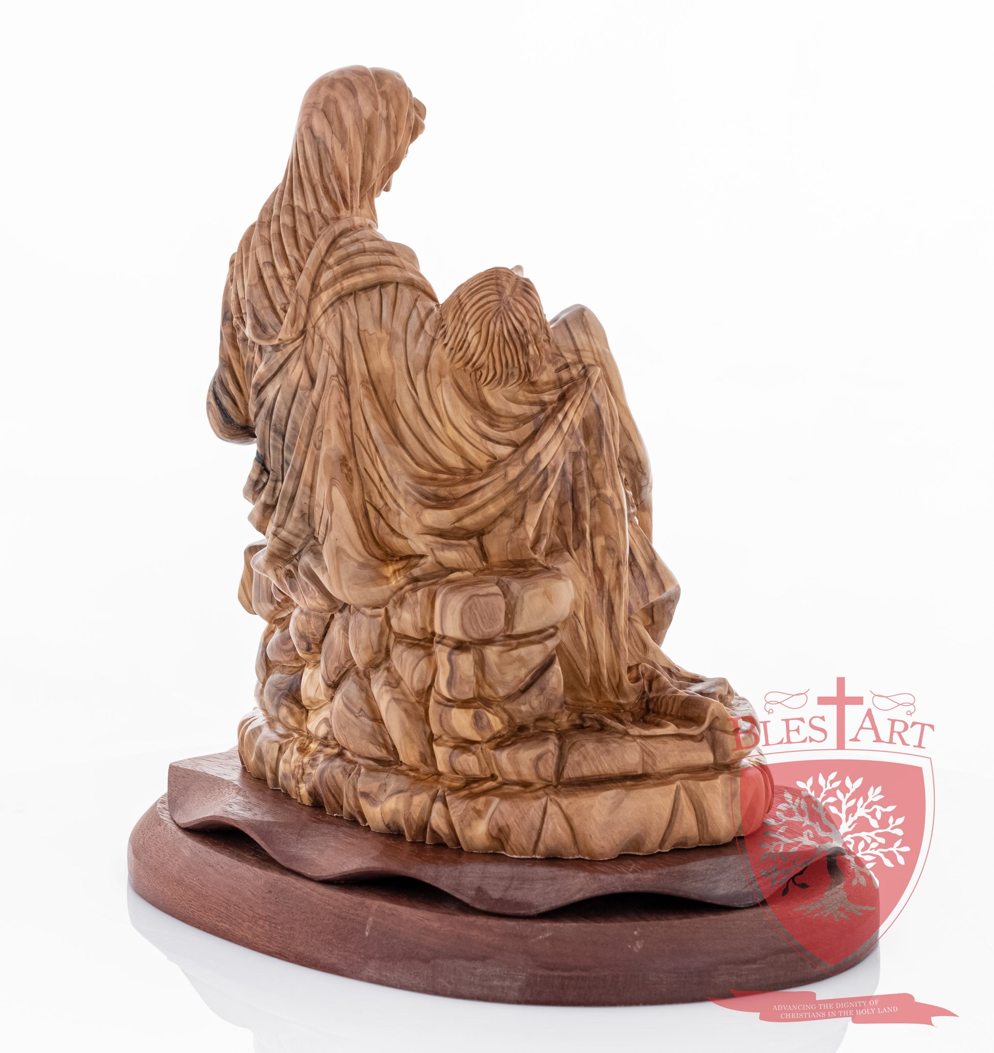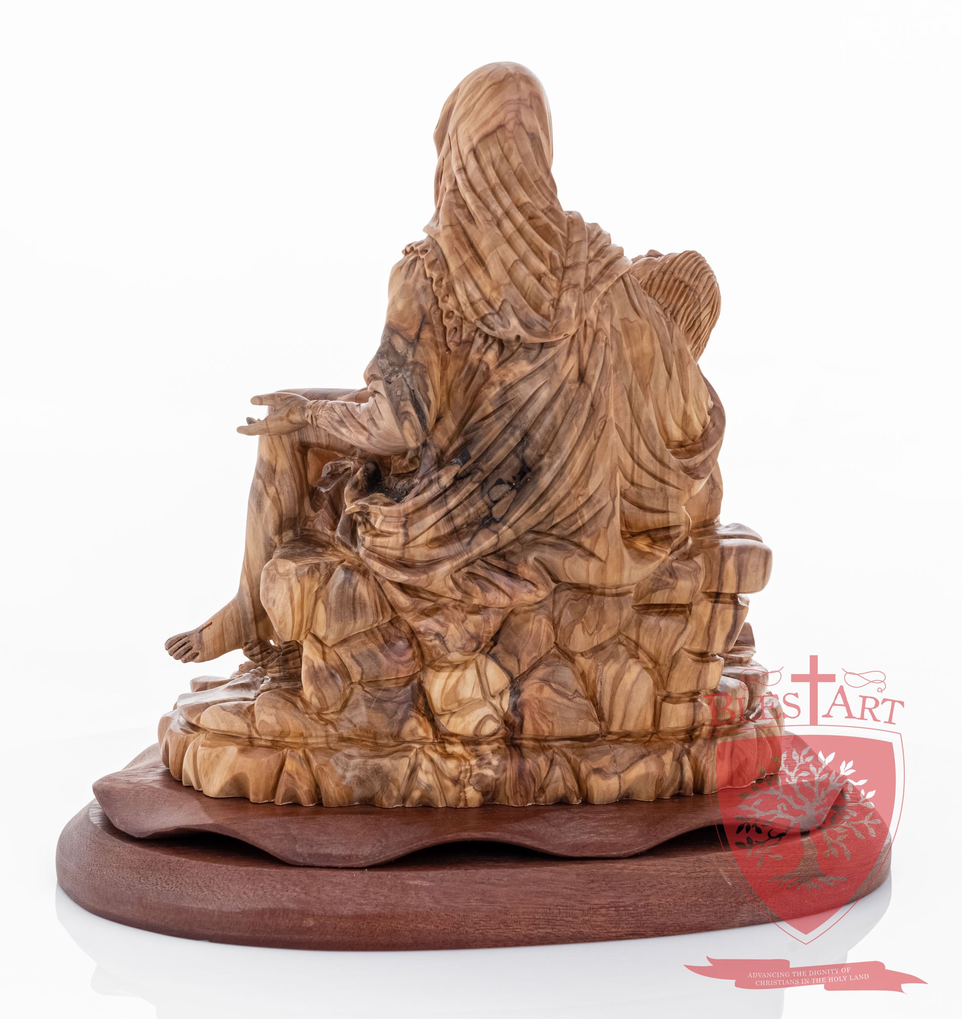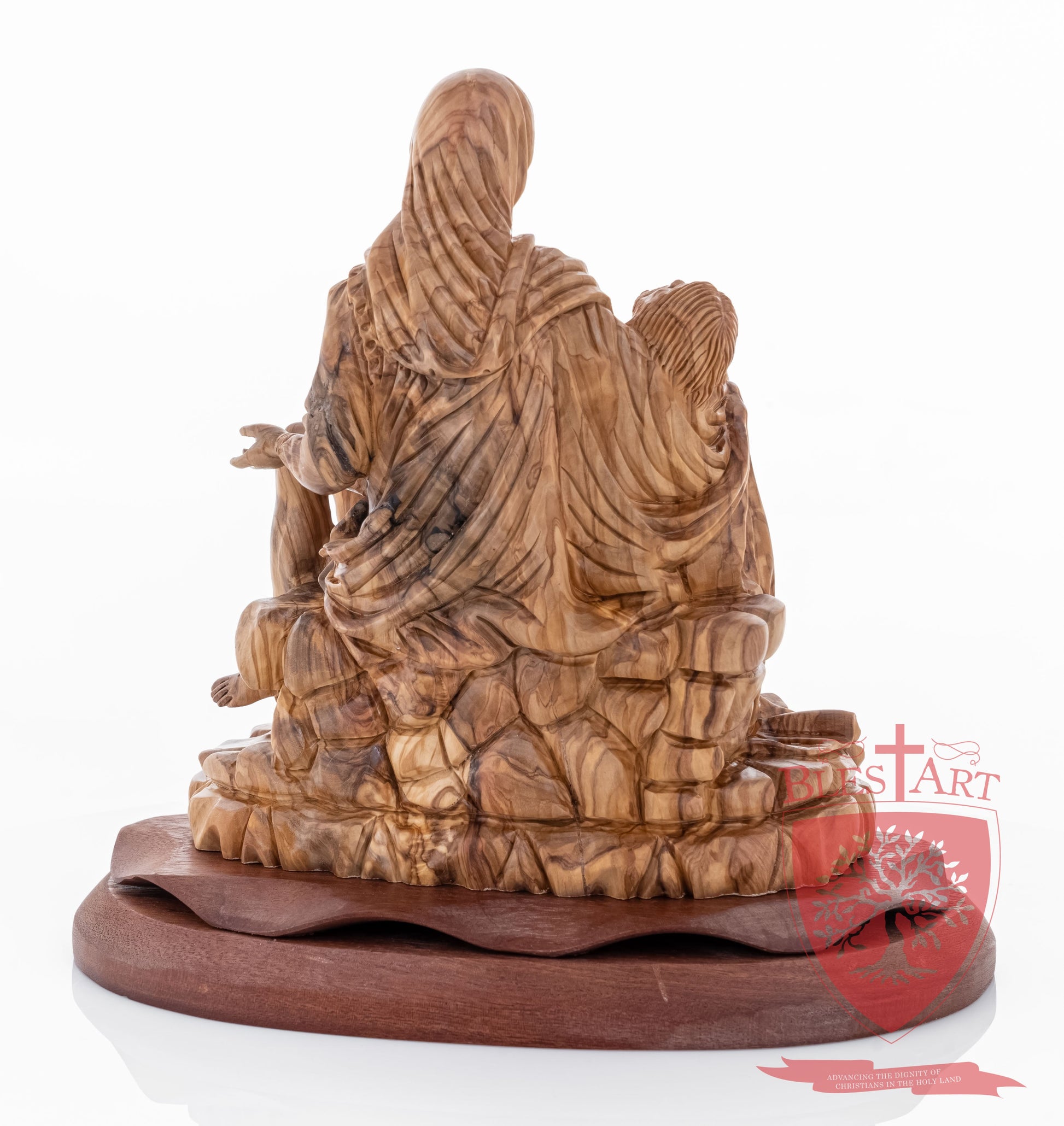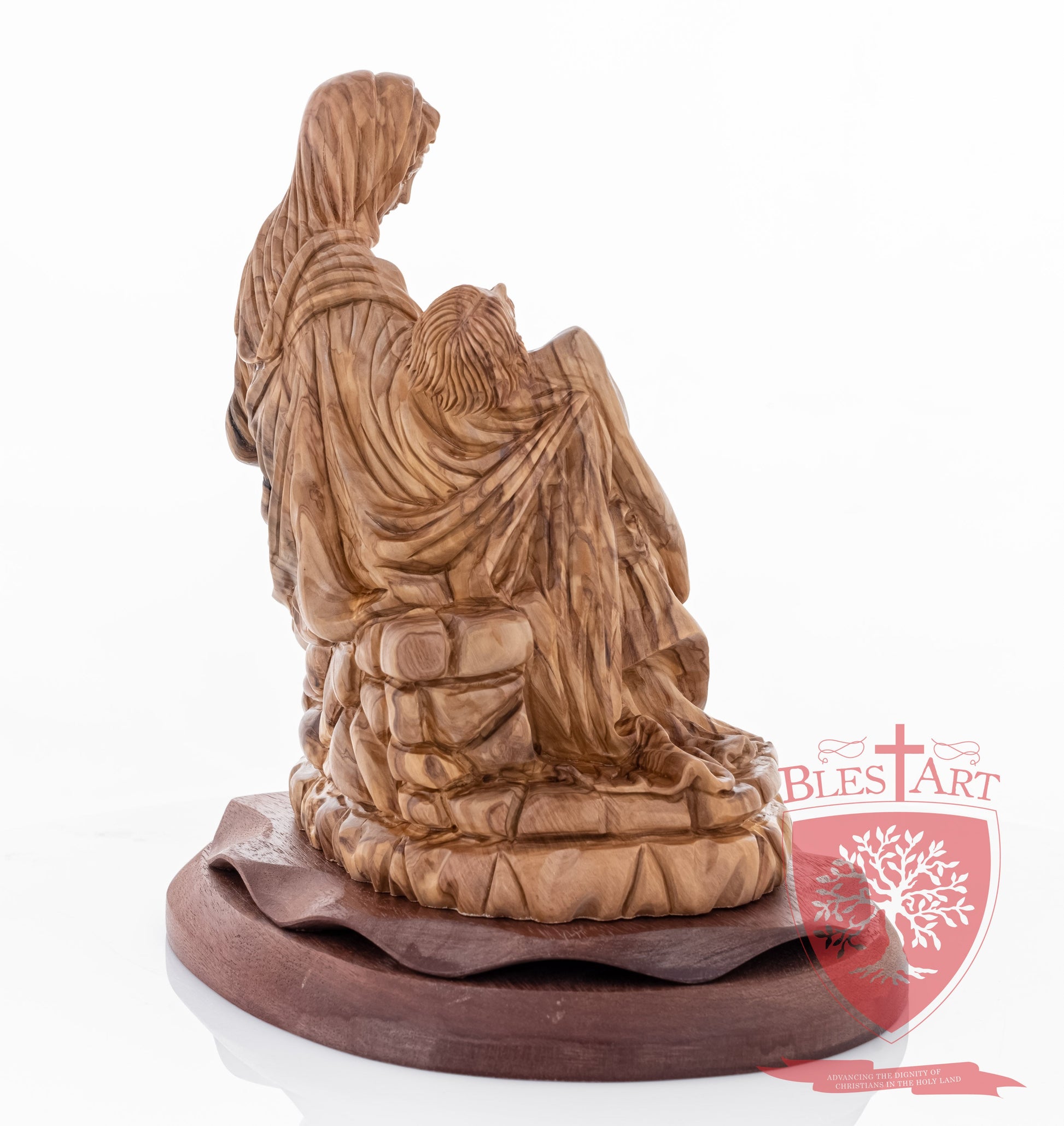 Prayerfully sculpted from sustainable olive wood, this statue depicts Mary holding Jesus after he is taken down from the cross. Mary is holding him in her arms with her eyes closed. She appears to be mourning his death. While hand-stained with a hand-applied antique wash, it still has a pale, natural finish and a finely distressed look.