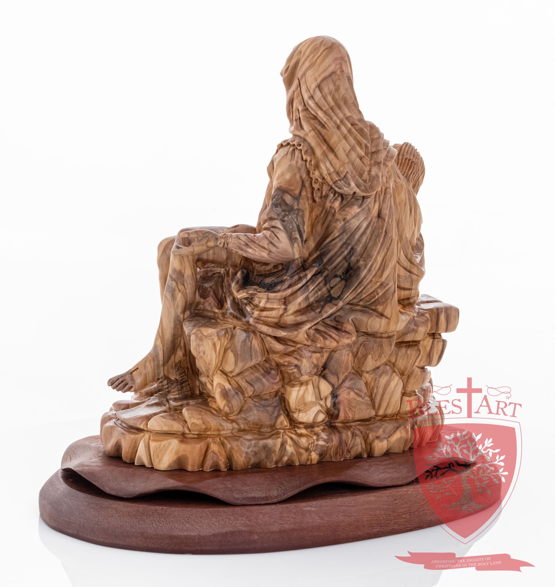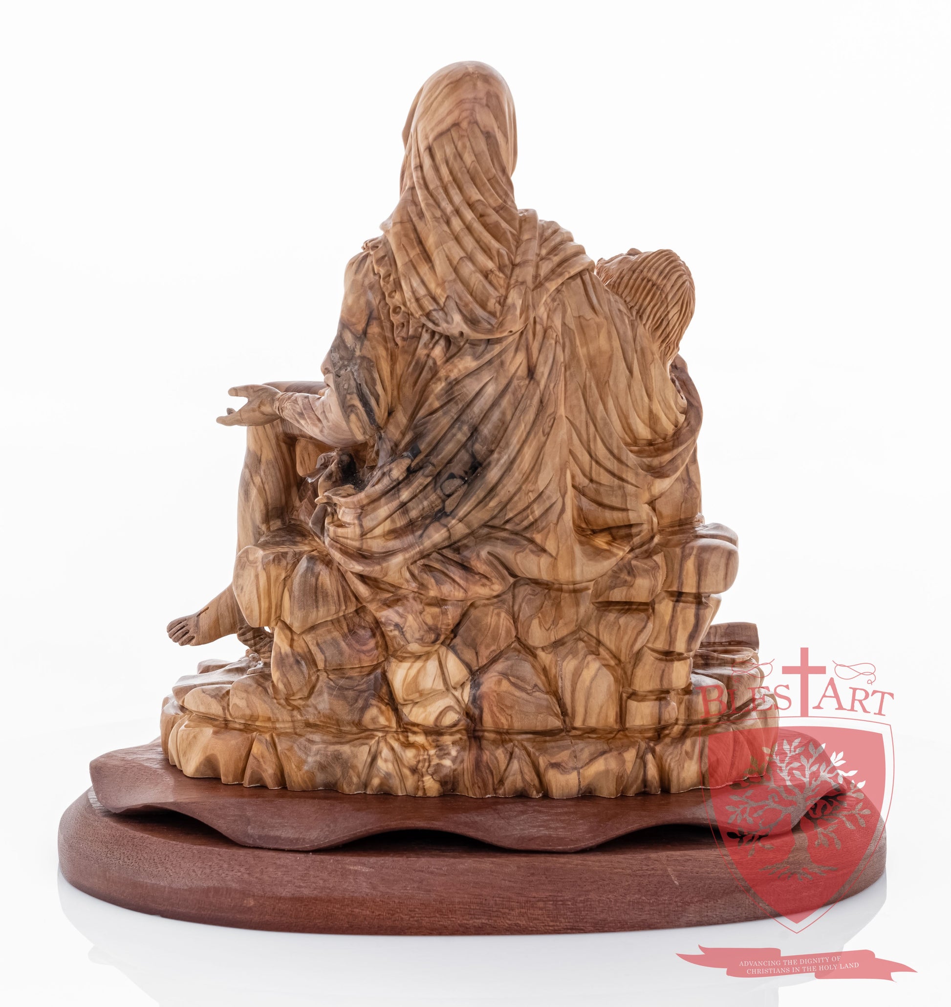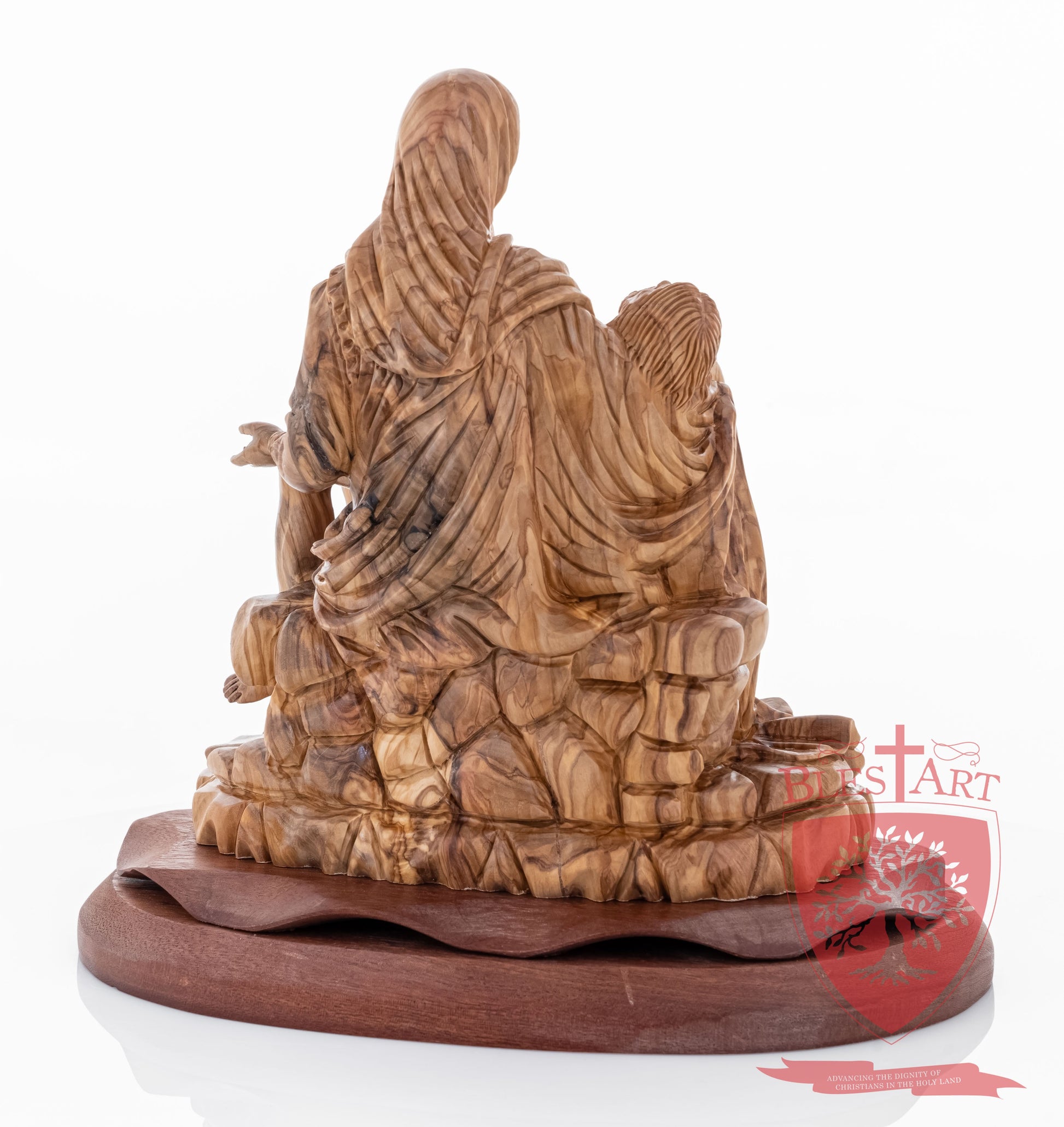 Prayerfully sculpted from sustainable olive wood, this statue depicts Mary holding Jesus after he is taken down from the cross. Mary is holding him in her arms with her eyes closed. She appears to be mourning his death. While hand-stained with a hand-applied antique wash, it still has a pale, natural finish and a finely distressed look.