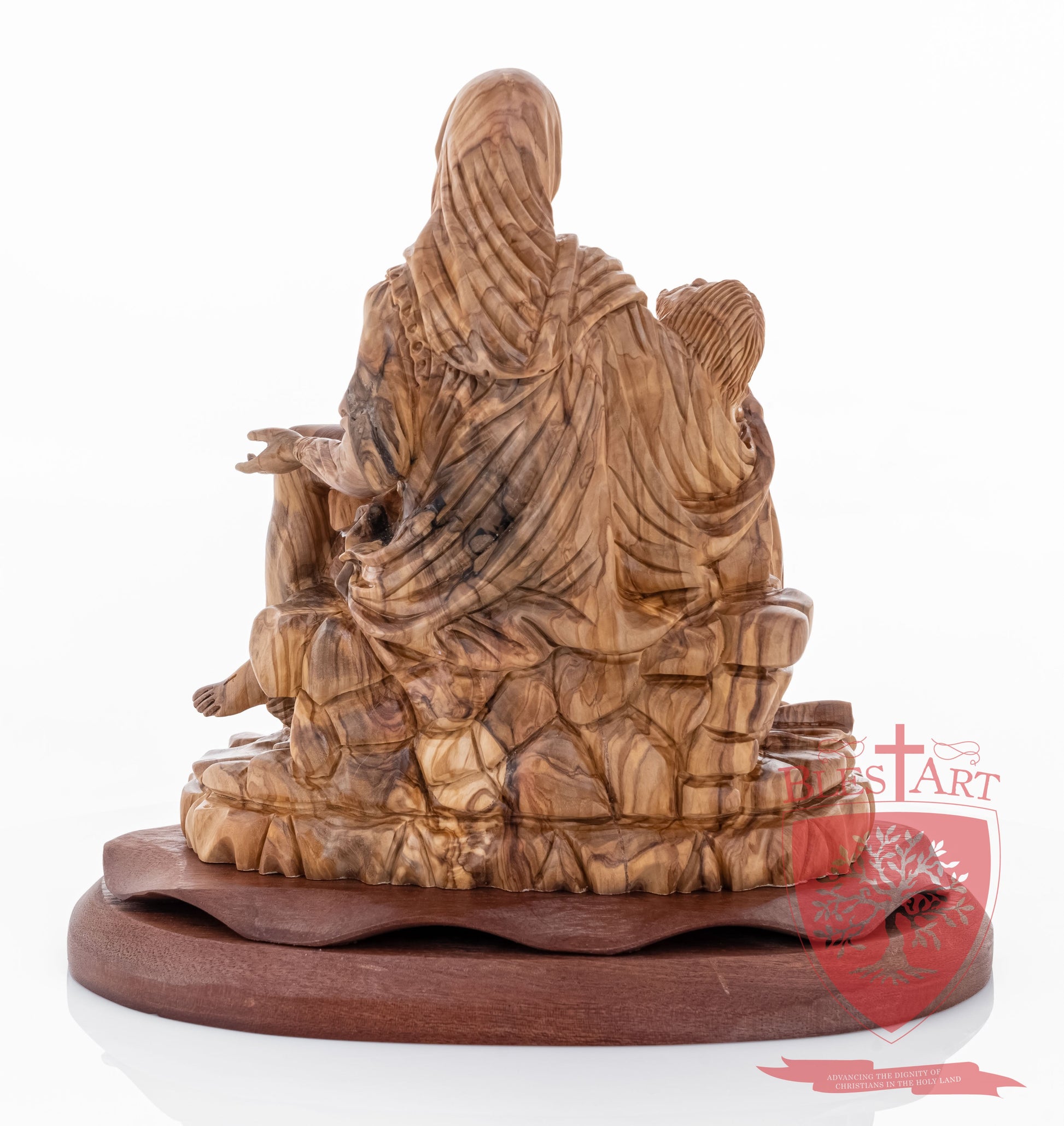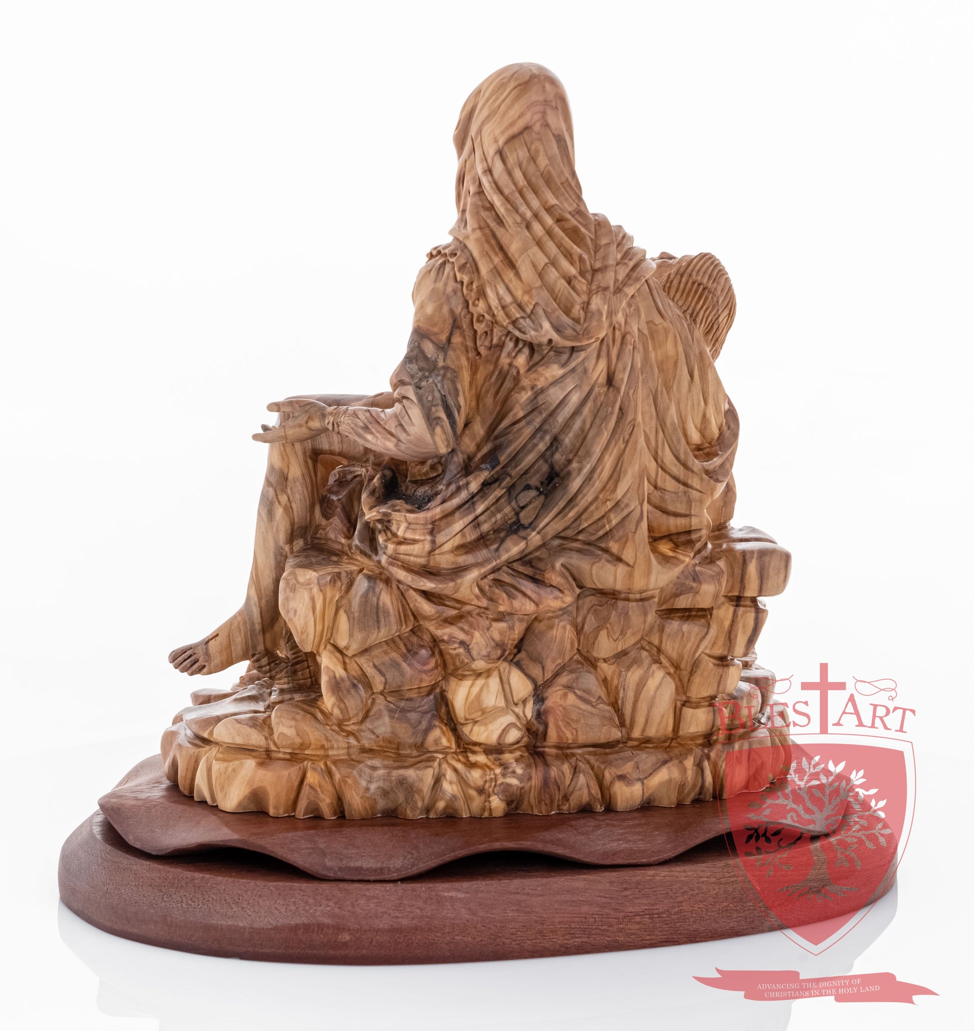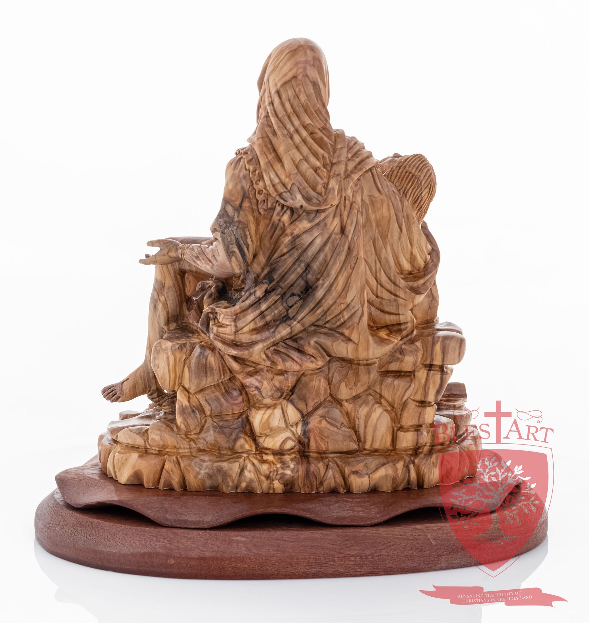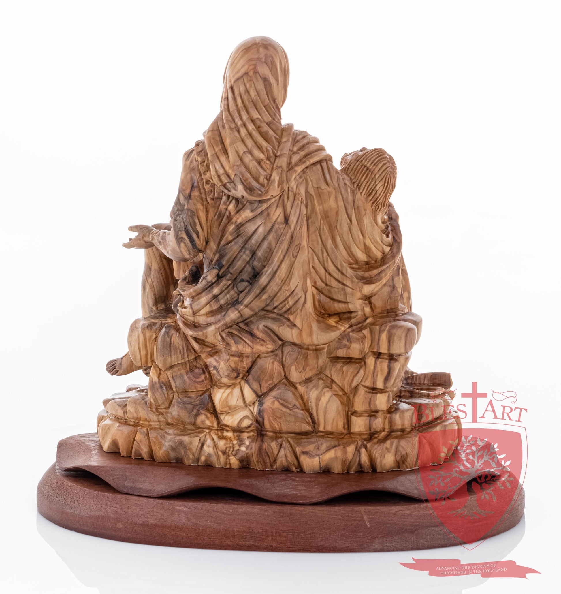 Prayerfully sculpted from sustainable olive wood, this statue depicts Mary holding Jesus after he is taken down from the cross. Mary is holding him in her arms with her eyes closed. She appears to be mourning his death. While hand-stained with a hand-applied antique wash, it still has a pale, natural finish and a finely distressed look.