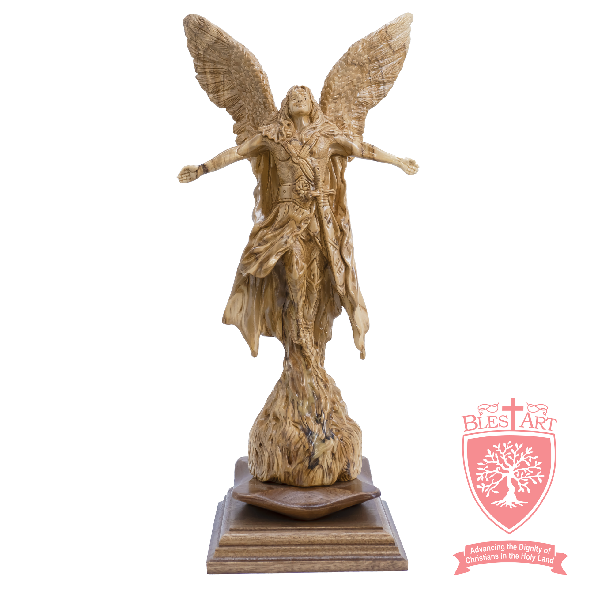 The way it was sculpted makes it look like it is flying out from the tree branch. This winged angel measures about 14" tall and is hand-carved from the finest olive wood by Christian families in the Holyland.