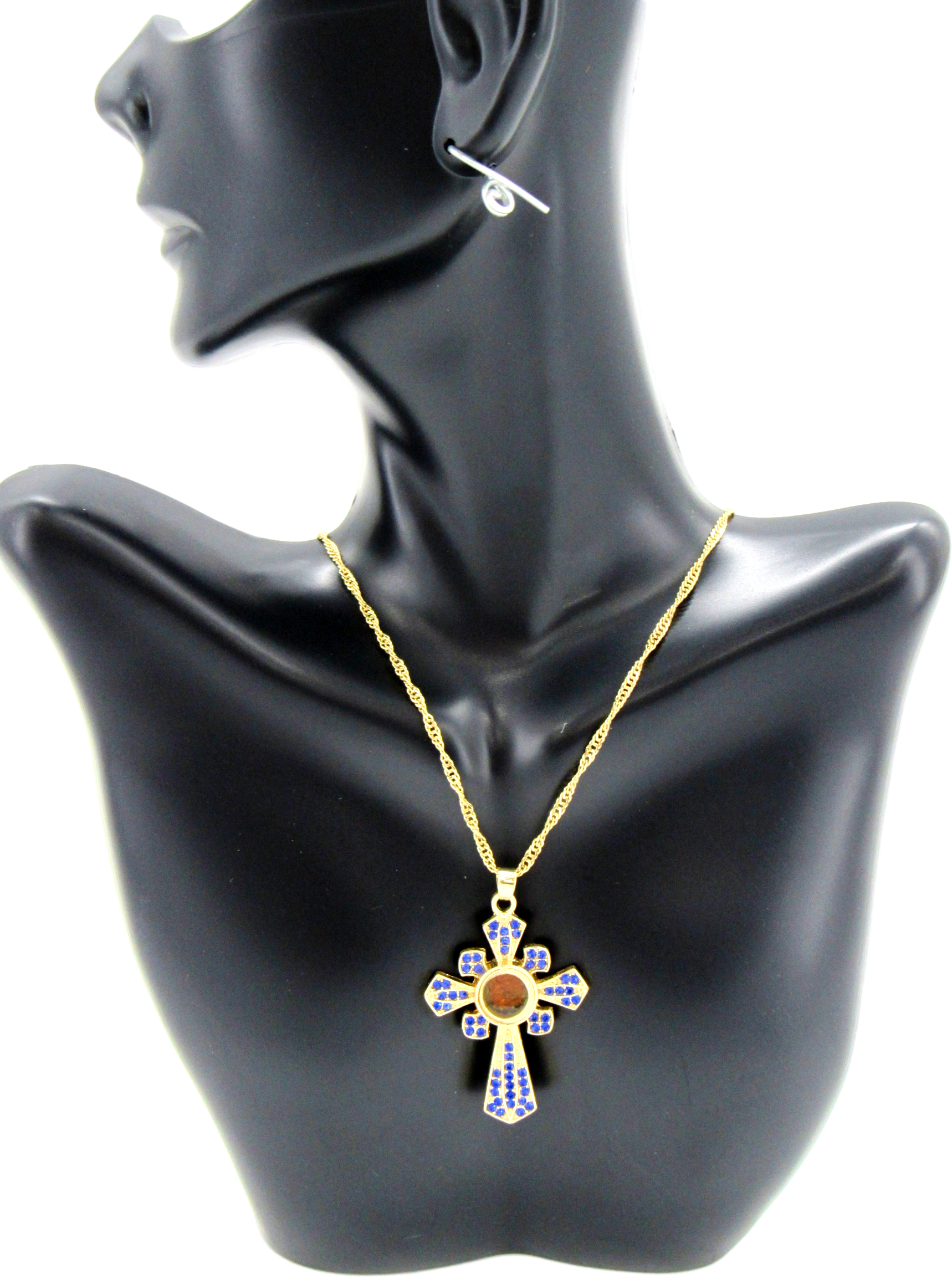 Handmade Gold plated Necklace, With Special Cross filled with incense from the Tomb of Jesus, Blue color.