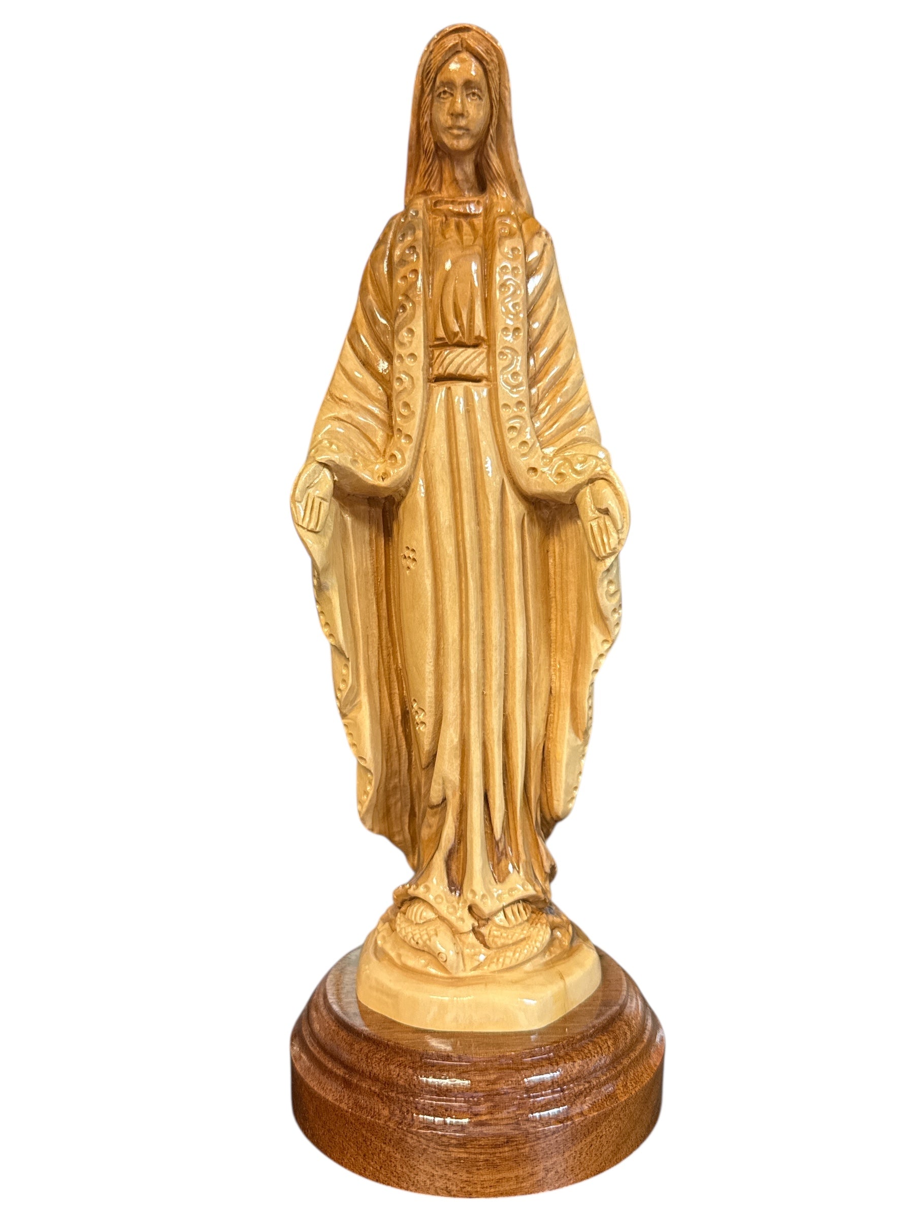 Mary stands upon the serpent, symbolizing her triumph over sin, and her serene expression invites prayer and peace into any home or sacred space. Mounted on a smooth round wooden base, this 9-inch-tall statue makes a beautiful devotional centerpiece or a meaningful gift for loved ones.
