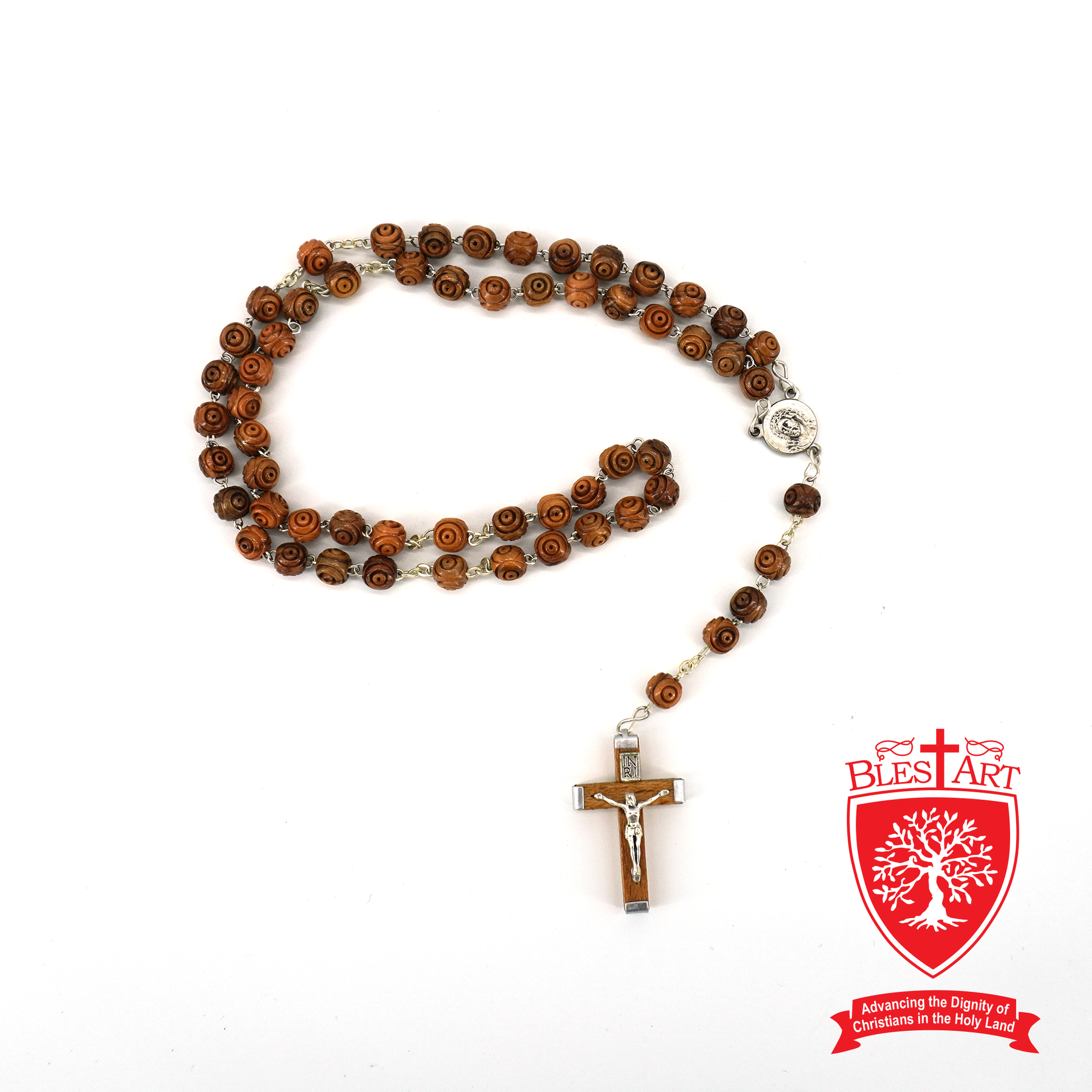hand made Olive wood Rosary with Rose-carved beads and Jesus metal Icon.
