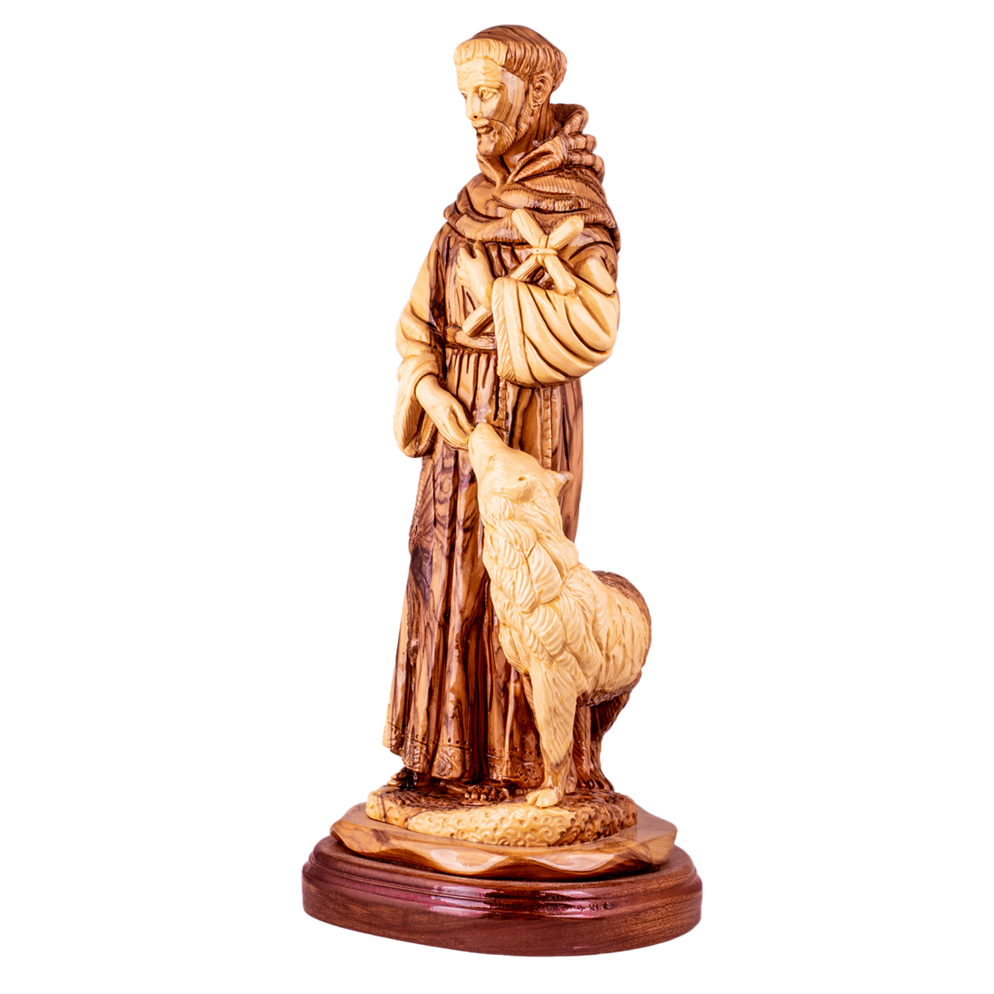 Olive wood hand carved St. Francis with the animals, Size: 5.8" x 5.5" x 11.8"